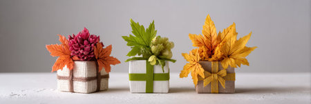 Colorful gift boxes adorned with artificial flowers and leaves in autumn hues are displayed on a simple, neutral background, capturing the essence of fall.
