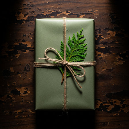 A carefully wrapped gift adorned with leaves and twine, resting on a wooden surface