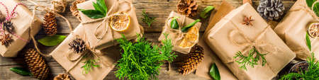 Collection of christmas gift boxes with natural rustic decorations. Organic vegan, no plastic concept, Zero waste life style.