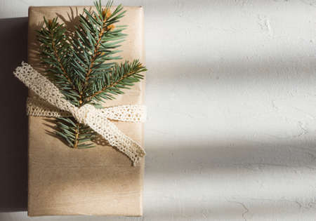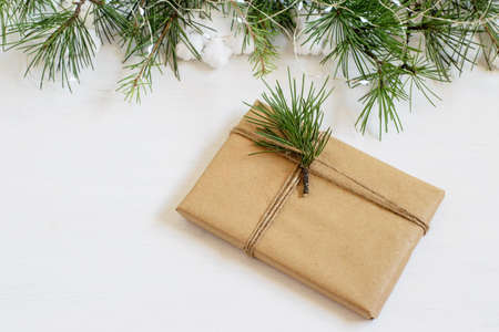 Handmade alternative Christmas gift box wrapped in grunge craft paper, christmas tree branches on the white background. Zero waste, plastic free, care packaging concepts. Mock up photo.