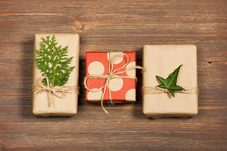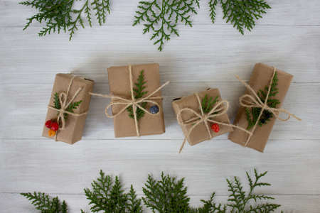 Gifts packed in a minimalistic style on a wooden background. The concept of stylish, minimalistic holidays, hipsters, trends, New Year, Christmas, birthday, etc.