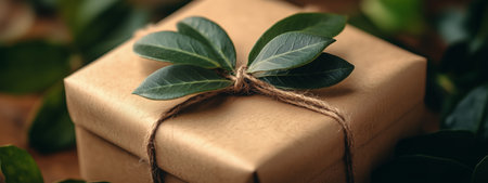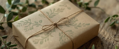 Eco-friendly gift box wrapped in kraft paper featuring a delicate leaf pattern, tied with natural twine, placed on a rustic wooden surface with greenery.