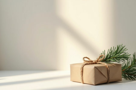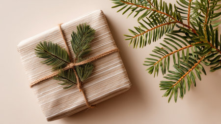 This image features a gift box elegantly wrapped with twine and a pine sprig, accompanied by a fresh evergreen branch, perfect for holiday themes.