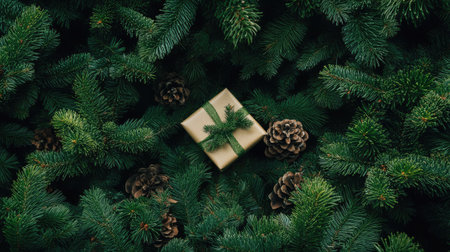 Background of a gift box surrounded by the natural beauty of a pine tree, bringing a festive and nature-inspired touch to holiday decor.