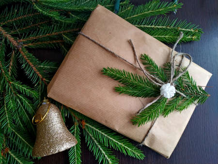 a christmas gift wrapped in craft paper and tied with linen thread with a mock-up next to fir branches and golden bells