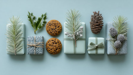 A captivating arrangement of beautifully wrapped gifts and delicious cookies, accented with natural elements, creating a festive atmosphere perfect for holiday celebrations.
