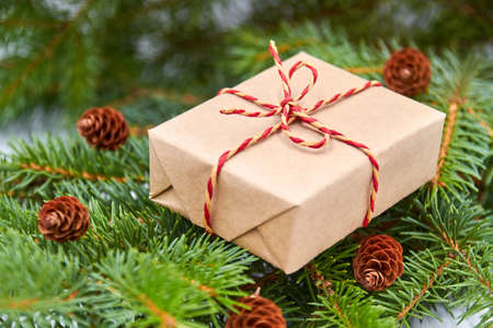 Christmas gift box on fir branches with cones. Close-up, selective focus