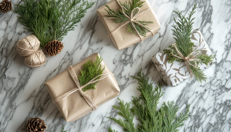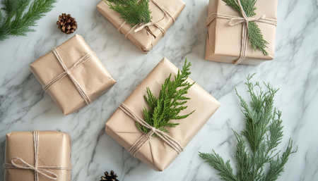 Elegant gift presentation brown paper wraps with twine and greenery on a marble tabletop