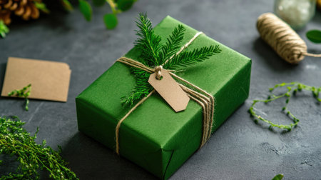 This image showcases a beautifully wrapped green gift box adorned with natural twine and evergreen decoration, ideal for holiday celebrations.