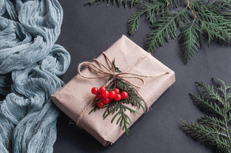 Gift box next to vintage runners gray and spruce leaves red berries on black background, holiday composition on dark paper