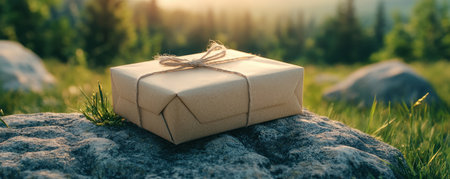 A rustic gift box, wrapped in brown paper and twine, rests on a rock amidst a sunny, natural landscape Inside, a heartfelt note awaits This outdoor setting, capturing the essence of thoughtful giving, highlights the simple beauty of a present ready to be cherished The image evokes heartfelt moments and AI Generative