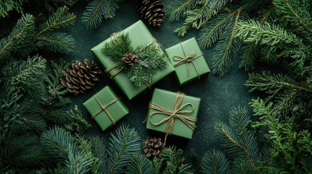 Christmas gift boxes in green, surrounded by lush pine branches, creating a natural and serene holiday vibe on a green backdrop.