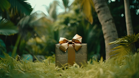 Gift box with golden bow on green grass in tropical garden.
