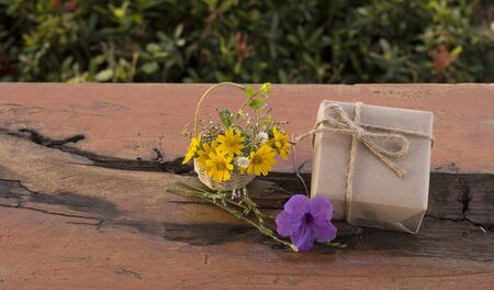 Brown handmade gift box and flower basket on wooden floor with cracks. The backdrop of the needle plunger.