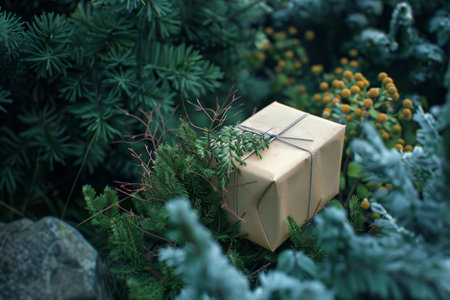 Holiday scene with a beautifully wrapped gift box placed near a pine tree, capturing the essence of Christmas spirit and festive celebrations.