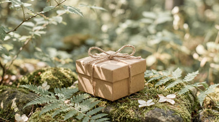 Small kraft paper gift box with rustic twine bow placed on mossy forest floor surrounded by green ferns and soft natural sunlight.
