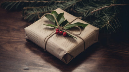 Gift wrapped in paper with red berries and green foliage, Christmas holiday, background, copy space, AI generated