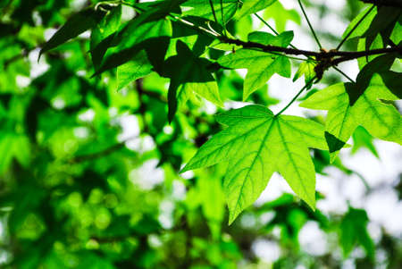 Beautiful, fresh, green leaves in the summer sunlight. Vibrant forest scenery of Northern Europe.