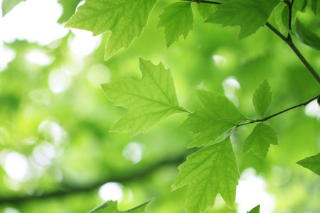 Natural green leaves on bokeh with sun light and blurred greenery background in garden with copy space. Safe world and ecology concept.
