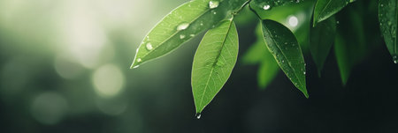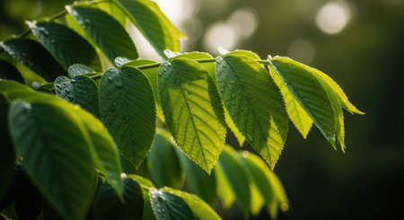 Sparkling water droplets clinging to vibrant green leaves in a lush forest capture natures beauty after rain, with soft sunlight filtering through the canopy