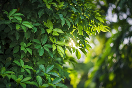 Depth showing lush green foliage illuminated by dappled sunlight creating a vibrant, natural bokeh effect with soft focus and a sense of depth and tranquility...