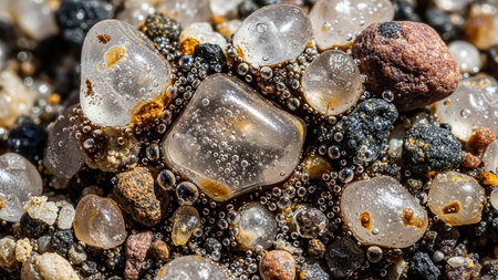 Extreme macro shot of wet sand grains, small pebbles, and tiny bubbles, revealing intricate textures and details.