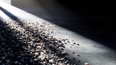 Random dark rock particles spread on a smooth floor with directional shadow lighting