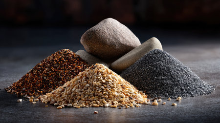 Textured arrangement of sand, pebbles, salt, and stones.