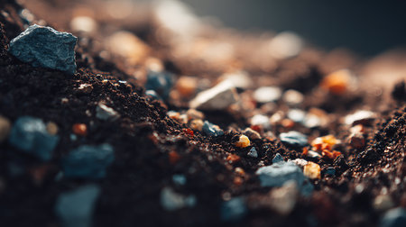 A macro view of small pebbles and soil, showing a variety of colors and granular textures in sharp detail.