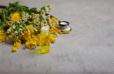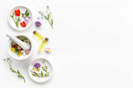 Aromatherapy bottle and flowers on white textured background as naturpathy concept