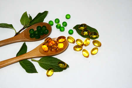 Top view Variety of vitamin and herbs on white background. Top view of assorted pharmaceutical medicine pills. Natural healthcare product.