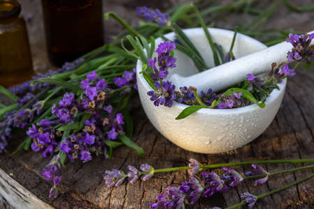 Healing herbs on wooden table. Herbal oil in a glass bottle. Cosmetic organic essential oil. Herbal medicine bottle with flowers. Fresh herbs from the garden for aromatherapy.