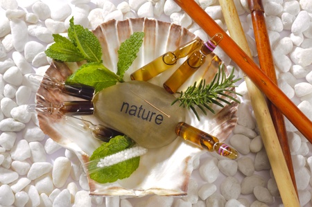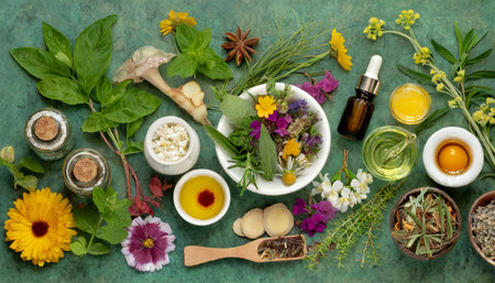 Natural herbal plant and flower remedies with herbs and summer flowers. Used in skincare for anti ageing benefits and can ease psoriasis, acne and eczema skin problems. On pastel green.