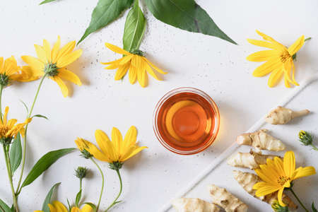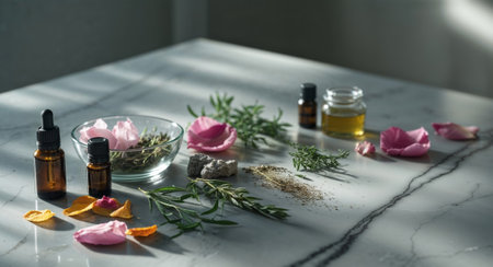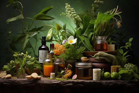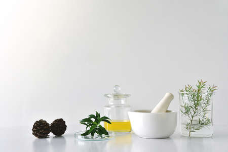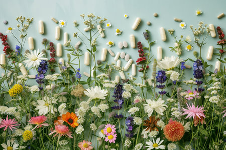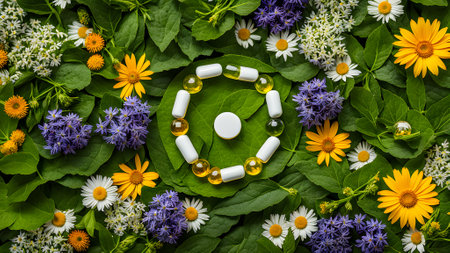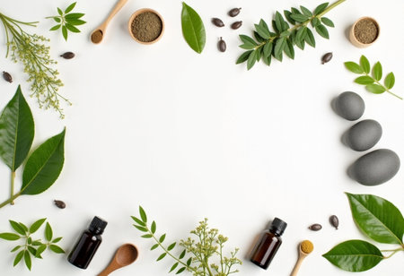 Modern flat lay style showcasing herbal medicine and cosmetic background