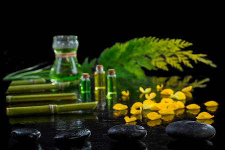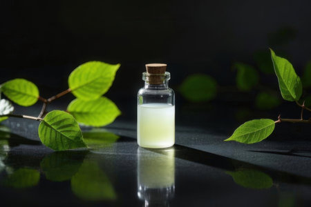 Bottle with herbal serum, oil cosmetic ad, simple and natural skincare concept, product mock up set with water ripple aside with green leaf