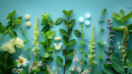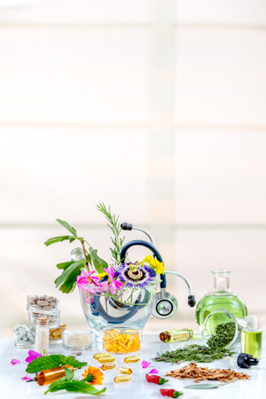 Plant based supplements, natural vitamins with fresh herbs and flowers. Organic ingredients medication suggesting holistic health concepts, alternative lifestyle. Light stone background, top view