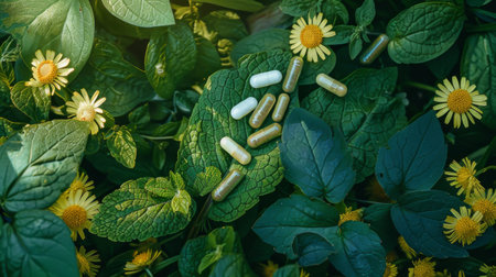 A bunch of pills and capsules are scattered on a leafy green plant. The pills are of different colors and sizes, and they are surrounded by the leaves of the plant