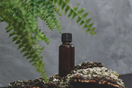 composition with glass bottle of body care organic cosmetics on tree bark pedestal with real, mosses Cosmetic background mock up for product presentation.