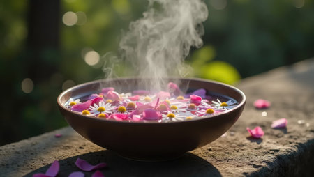 Dried colorful flowers arranged in a white bowl on a rustic wooden table, with scattered petals and natural elements around. Concept of nature