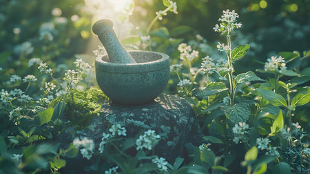 Herbs and mortar with chamomile on a white background with place for text. Flat lay, top view, copy space. Health and medicine, alternative medicine