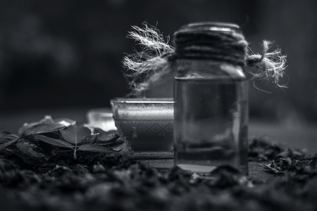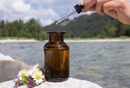 Herbal medicine or aromatherapy dropper bottle. Medical marijuana products. Essential liquid. Essential oil or oil for natural diseases treatment in glass bottle. Natural herbal medicine concept