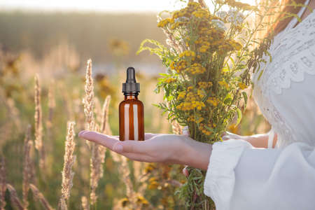 A woman in a white dress is holding a brown glass bottle and a bouquet of herbs. A blank label with space for a description. Alternative Medicine and natural remedies. The idyllic atmosphere of the photo.