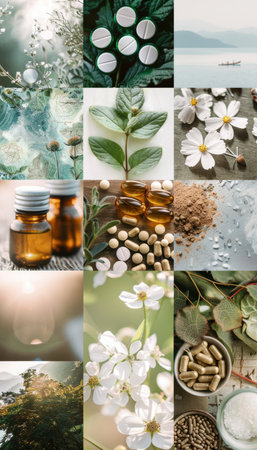 Holistic Wellness Moodboard Featuring Herbal Supplements and Serene Natural Landscapes