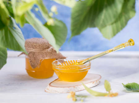 Linden Honey in Jar and bowl with a honey dipper on a white wooden table. Defocused branch of linden in the foreground.