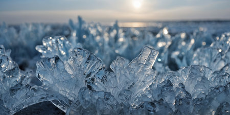 Stunning view of ice crystals along a frozen river, capturing the warm sunlight shimmering on the icy surface during sunset. Perfect winter scenery.