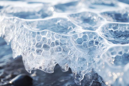 Delicate honeycomb patterns emerge as ice crystals naturally form on a frozen lake, capturing the beauty of winter in stunning detail and clarity during early daylight.
