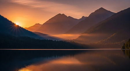 A breathtaking sunset over a still mountain lake, with the reflection of the colorful clouds in the water.
