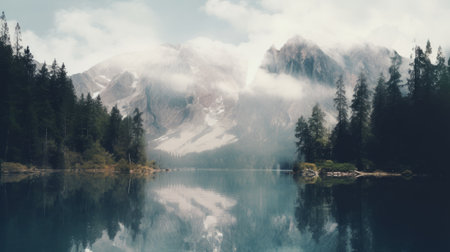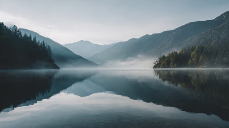 a serene lake surrounded by misty fog and towering wooded peaks creates a captivating scene. this atmospheric portrait, with its dark white and turquoise hues, captures the essence of japanese-inspired imagery. the detailed marine views and the use of schlieren photography add a unique touch to this 8k image. ephraim moses lilien's influence is evident in the composition. ai generated