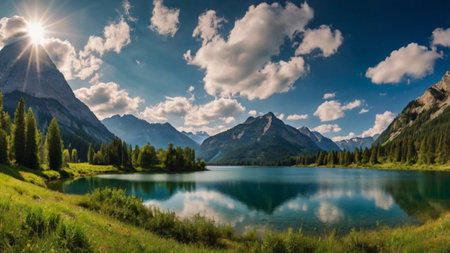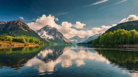 panoramic view of alpine lake with reflection of mountains and clouds