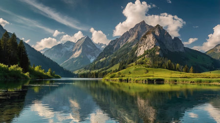 Beautiful panoramic view of mountain lake with reflection in water